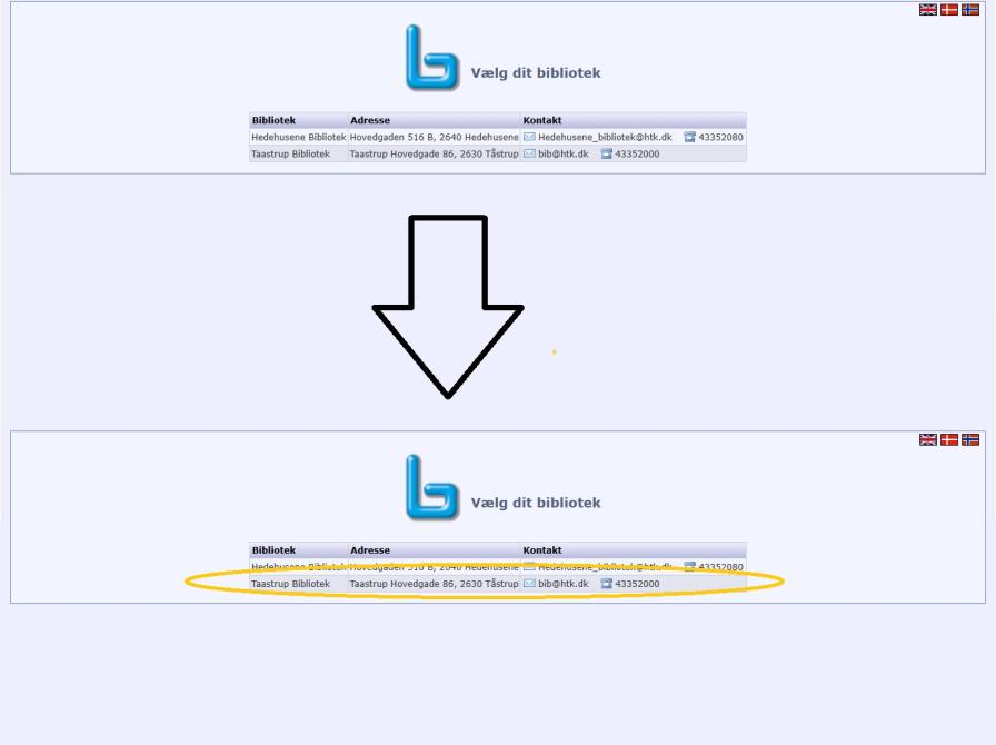 Vi bliver mødt af denne skærm, og vælger Taastrup Bibliotek.