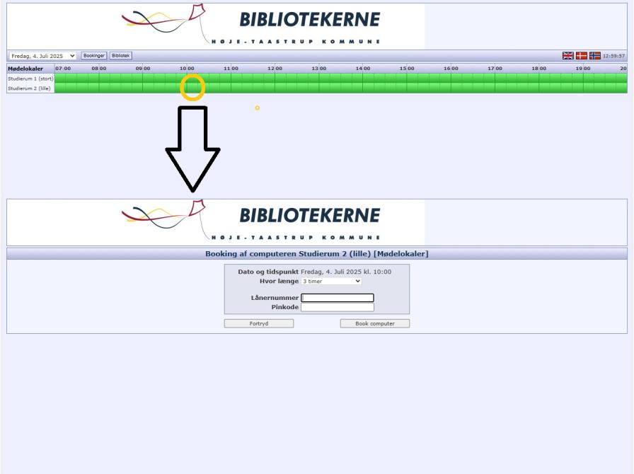 På denne side klikker vi på boksen ud for studierum 2 (det lille), der starter kl. 10 (markeret med orange cirkel).