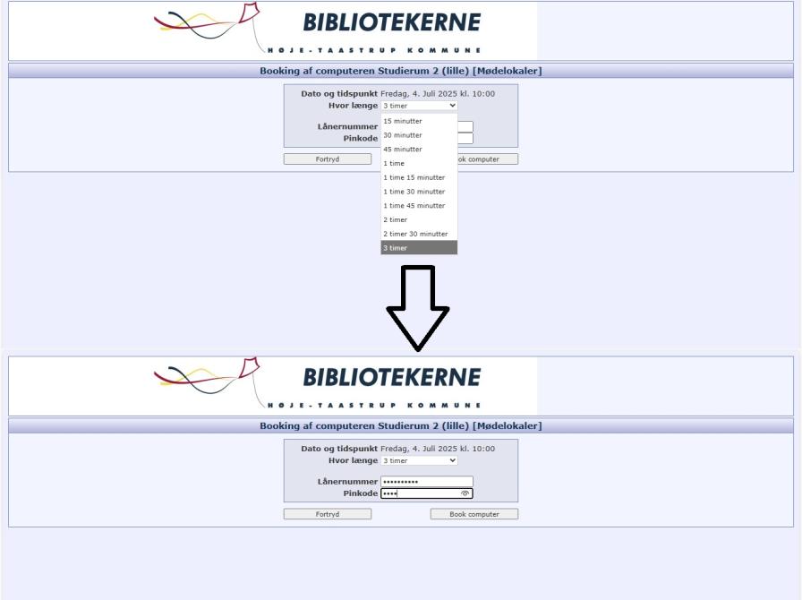 Herefter indtaster vi vores CPR-nummer og pinkode til biblioteket og trykker "book computer".