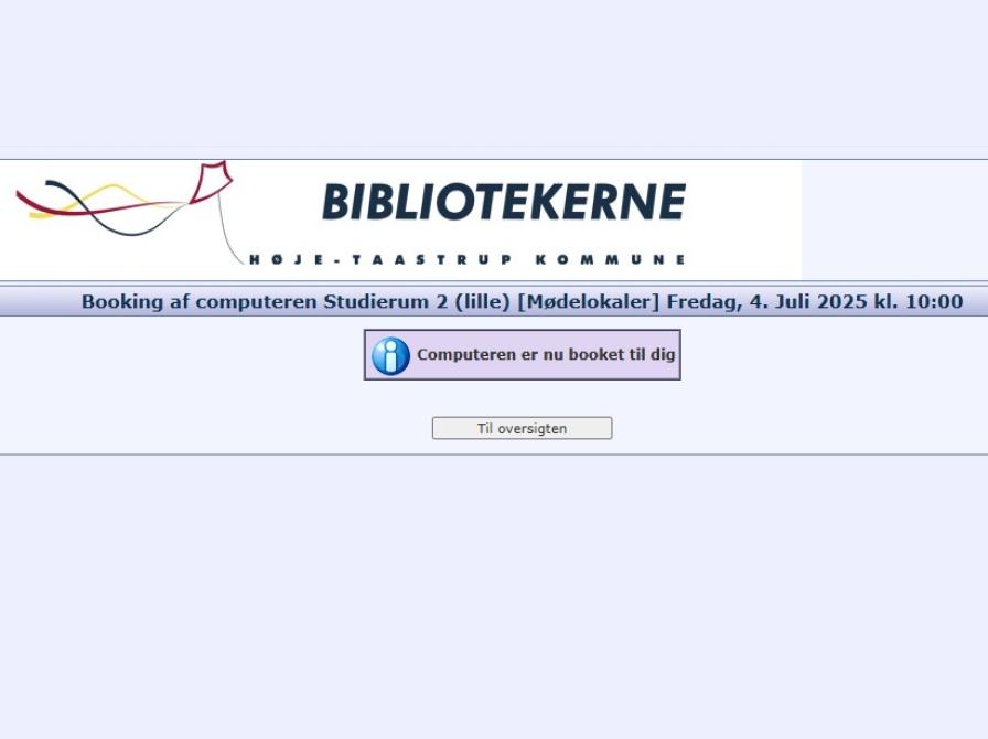 Eksemplet herunder tager udgangspunkt i at vi vil booke det lille studielokale på Taastrup Bibliotek fredag d. 4. juli kl. 10.