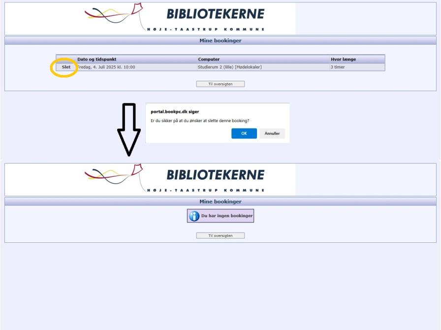Her på siden kan du se din booking. Tryk slet (markeret med orange cirkel) og bekræft, hvis der kommer en pop-up-notifikation, der spørger om du er sikker på at du vil slette din booking. Bookingen er nu slettet.