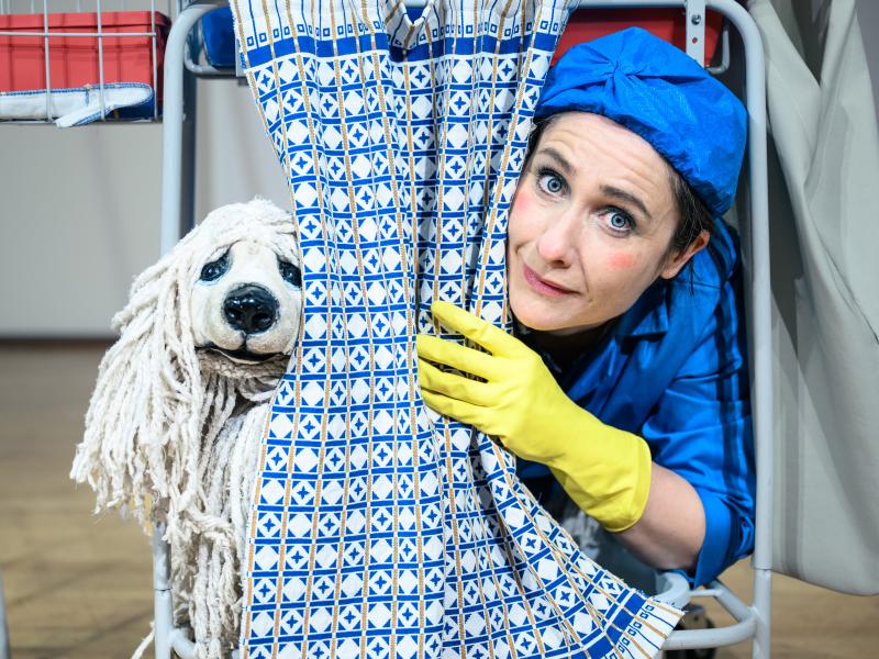 En rengøringsassistent bevæger sin gulvmoppe hen over gulvet med præcise bevægelser. Pludselig – vuf! – springer en blød hund ved navn Pølse, ud af rengøringsvognen.