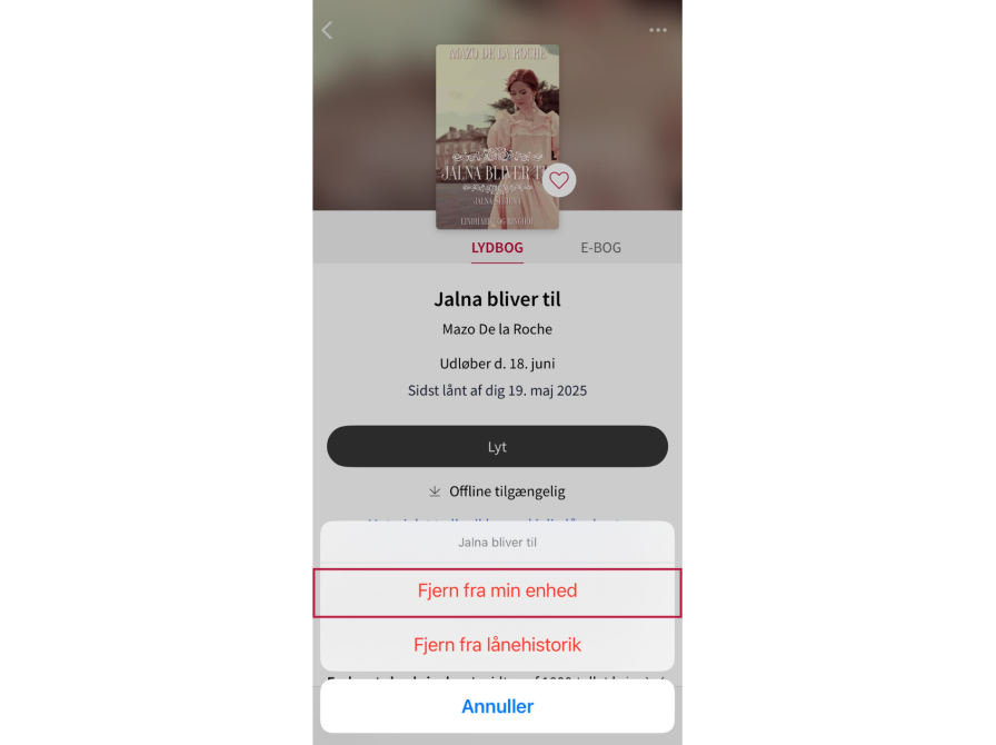 Du får nu mulighed for at fjerne den downloadede titel. Den forsvinder ikke fra dine lån, og du kan stadigvæk høre den online. E-bøger skal dog downloades for at kunne blive læst.